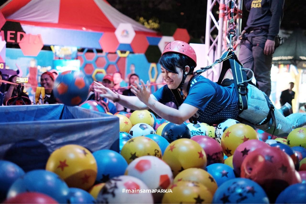 Kalau kamu pernah main claw machine—mesin pencapit hadiah di mall yang bikin gemas sekaligus geregetan—kebayang nggak kalau versi manusianya beneran ada? Yup, bukan cuma imajinasi! Parkia Adventure menghadirkan wahana permainan unik bernama Combol (Comot Bola) dalam acara nonton bareng Piala Dunia 2018 yang digelar Transmedia di Lapangan Sunburst BSD, 6-15 Juli 2018 lalu.